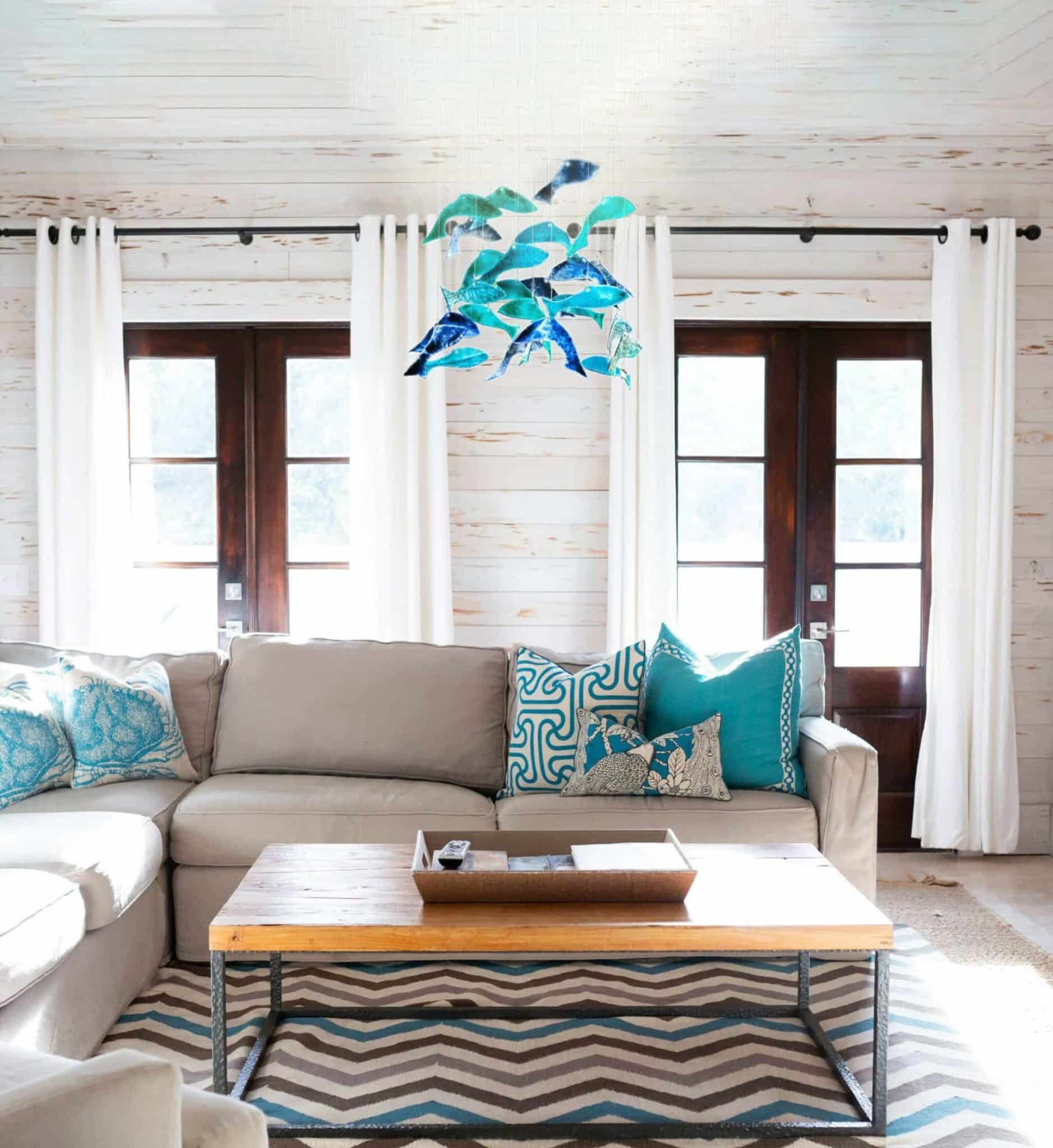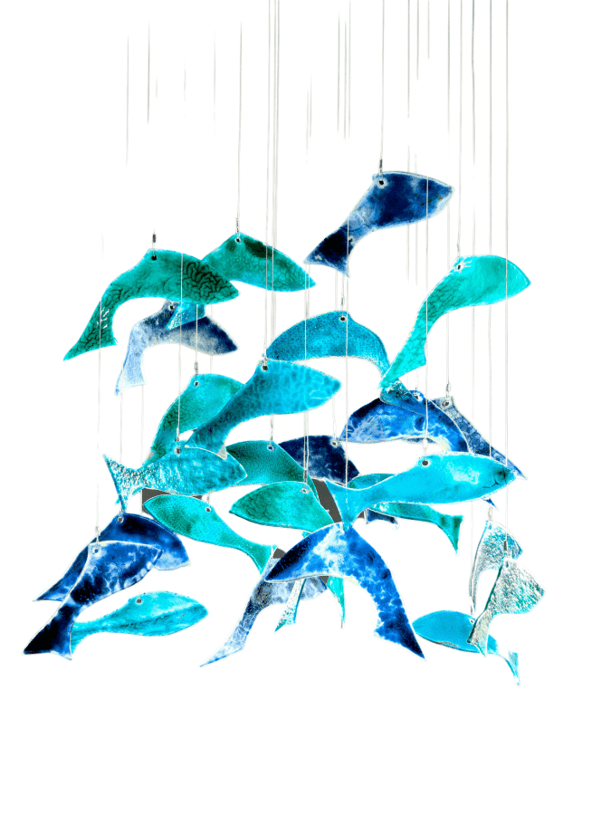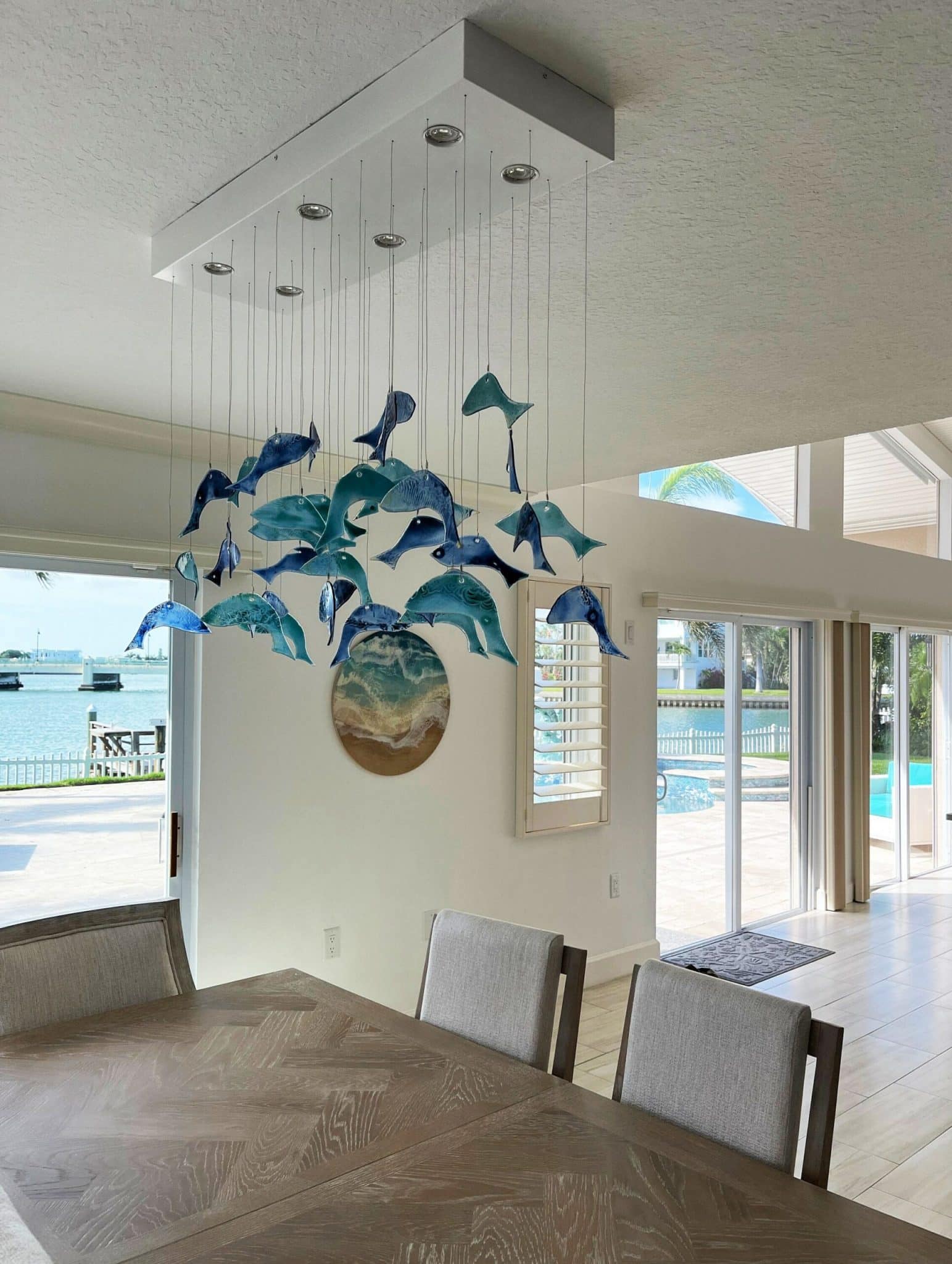 Stained glass fish chandelier, the perfect addition to any beach house modern or nautical decor style. This elegant and unique light pendant chandelier features a cascading design with sea glass hand-crafted fish various shades of blue and diverse shapes, creating a beautiful and mesmerizing display of light.